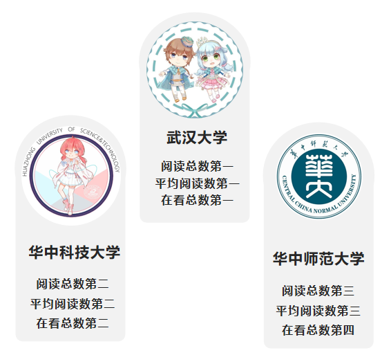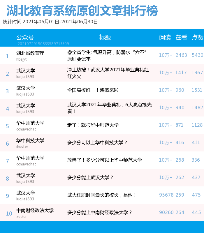 6月份,原創10萬+文章成績表現亮眼,由上期的3篇增長至本期的8篇。本期上榜閱讀量前十的文章“武漢大學”占據5席,“華中師范大學”占據3席,其余兩篇出自“湖北省教育廳”和“中南財經政法大學”。受到畢業季以及招生季的影響,高校畢業典禮、招生信息的關注度顯著提升,文章閱讀量前十名中有7篇均為相關內容,“多少分可以上華中科技大學?”“多少分能上武漢大學?”等文章均收獲10W+閱讀量。此外,暑假疊加雨季,“湖北省教育廳”發布的防溺水提示斬獲最高的閱讀量、點贊量,居于榜單首位。