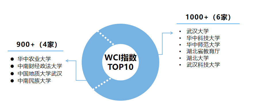 本期榜單中,“武漢大學”“華中科技大學”“華中師范大學”仍舊穩占前三甲寶座,與上期保持一致,“湖北省教育廳”再度回歸榜單,列居第四位。本期榜單再度回歸的還有“中國地質大學武漢”。與之相對,被擠出榜單的是“武漢理工大學”,“武漢教育”繼上期首次上榜后本期未能保持住掉出榜單。其他除“華中農業大學”排名保持不變外,均有一至兩名的小幅波動。從榜單數據情況來看,與上期相比,綜合WCI指數整體提升明顯,前十名得分均在900分以上,末位得分較上期高出80分左右。