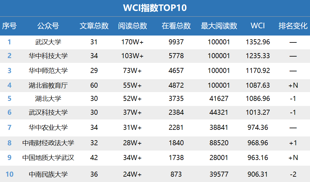 從WCI指數來看,本期前十名得分均在900分之上,尾部賬號得分提升,整體分差縮小。超過1000的賬號有6家,較上期增加2家,分別是“武漢大學”“華中科技大學”“華中師范大學”“湖北省教育廳”“湖北大學”“武漢科技大學”;其余4家指數得分均在900-1000區間,包括“華中農業大學”“中南財經政法大學”“中國地質大學武漢”“中南民族大學”。