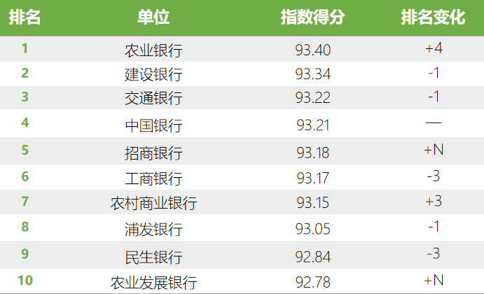 本期前三甲較上期均有所變動,農業銀行登頂榜首,建設銀行、交通銀行接連下降一位。觀察TOP10榜單可見,本期榜單整體成績較上期有所上升,除中國銀行外,各家銀行排名情況均有不同程度變化,招商銀行、農業發展銀行再登TOP10榜單,農業銀行、農村商業銀行排名上升,其他銀行排名均有不同程度下降。