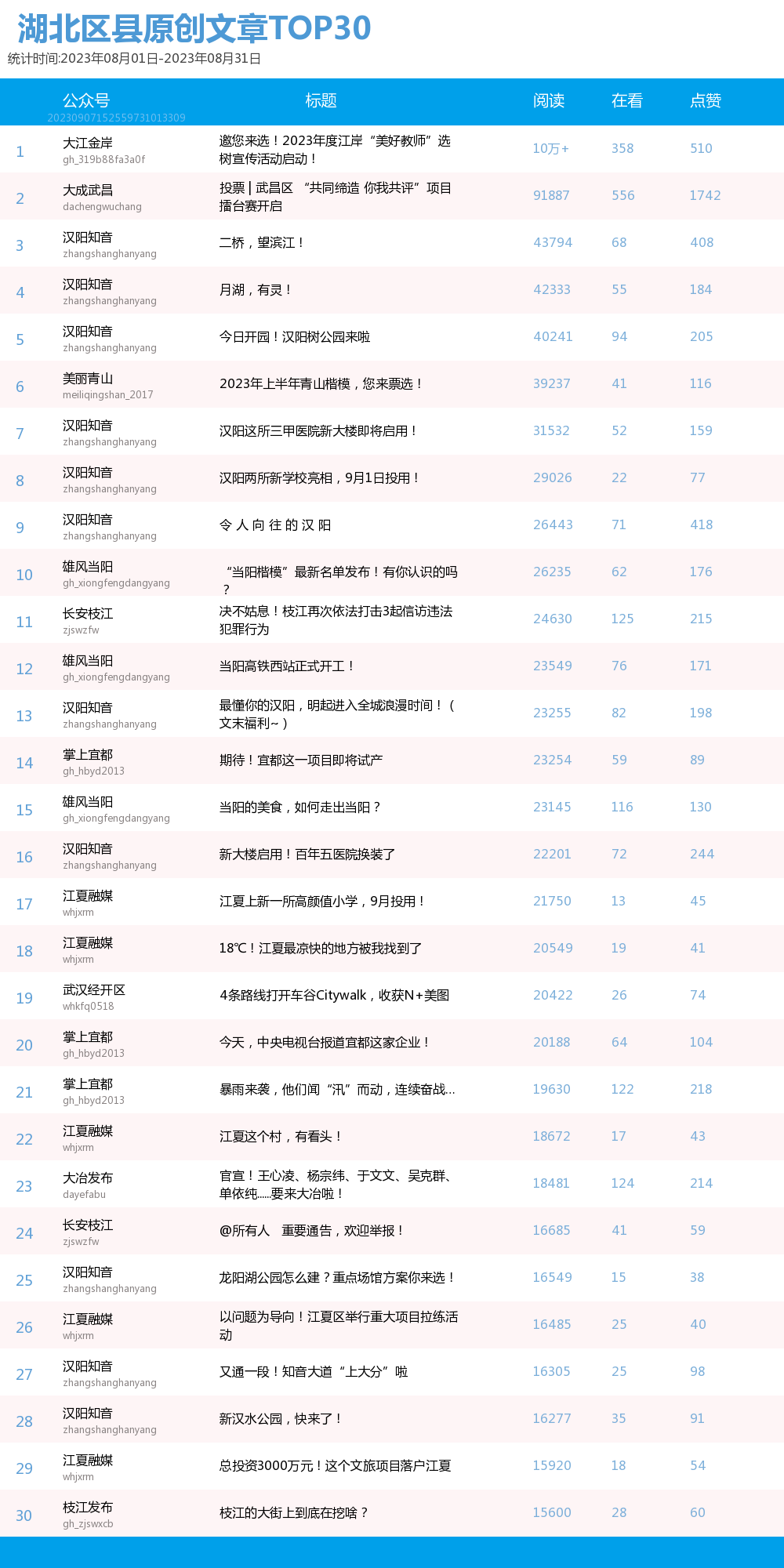 從原創文章閱讀量TOP30排行榜來看,“漢陽知音”攜11篇文章入圍,其中6篇文章進入榜單前十;“江夏融媒”攜5篇文章入圍;“雄風當陽”和“掌上宜都”均攜3篇文章入圍;“長安枝江”攜2篇文章入圍;“大成武昌”“大江金岸”“大冶發布”“美麗青山”“武漢經開區”“枝江發布”各攜1篇稿件入圍。