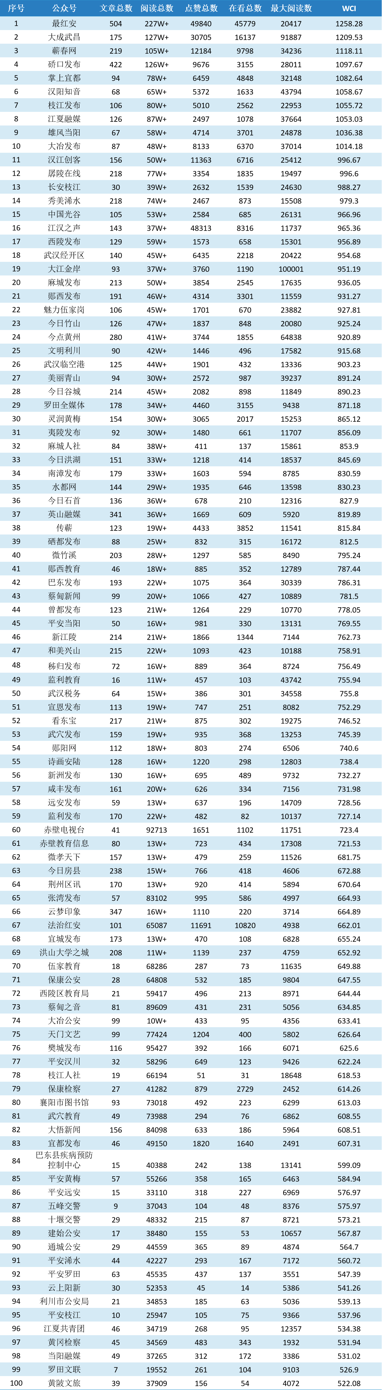 1、聚集湖北省內主要黨政機關政務微信公眾號,根據WCI指數數據進行科學排行,主要從“整體傳播力”“篇均傳播力”“頭條傳播力”“峰值傳播力”四個維度進行評價。