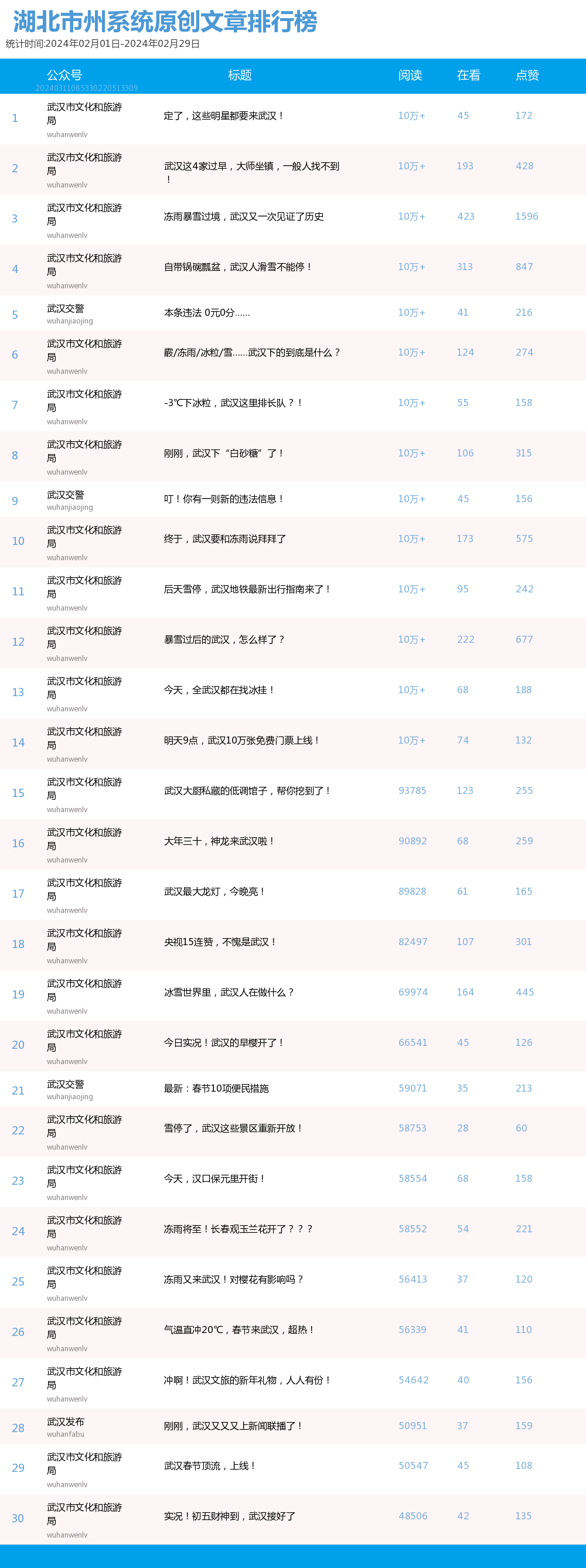 從原創文章排行榜看,本期上榜文章來自3個賬號,分別是“武漢市文化和旅游局”“武漢交警”“武漢發布”。原創熱文TOP30中,3家賬號發揮穩定,上榜篇數均與上月保持一致,“武漢市文化和旅游局”26篇,“武漢交警”3篇,“武漢發布”1篇。本期,閱讀量“10萬+”原創爆款文章數量較上月翻番,共計14篇,其中“武漢市文化和旅游局”包攬12篇,其余2篇由“武漢交警”發布。原創文章前十名閱讀量均破10萬,“武漢交警”發布文章《本條違法 0元0分……》《叮!你有一則新的違法信息!》分別居第5位和第9位;“武漢市文化和旅游局”以《定了,這些明星都要來武漢!》《武漢這4家過早,大師坐鎮,一般人找不到!》《凍雨暴雪過境,武漢又一次見證了歷史》《自帶鍋碗瓢盆,武漢人滑雪不能停!》包攬前四,《霰/凍雨/冰粒/雪……武漢下的到底是什么?》《-3℃下冰粒,武漢這里排長隊?!》《剛剛,武漢下“白砂糖”了!》《終于,武漢要和凍雨說拜拜了》等文章緊跟其后。