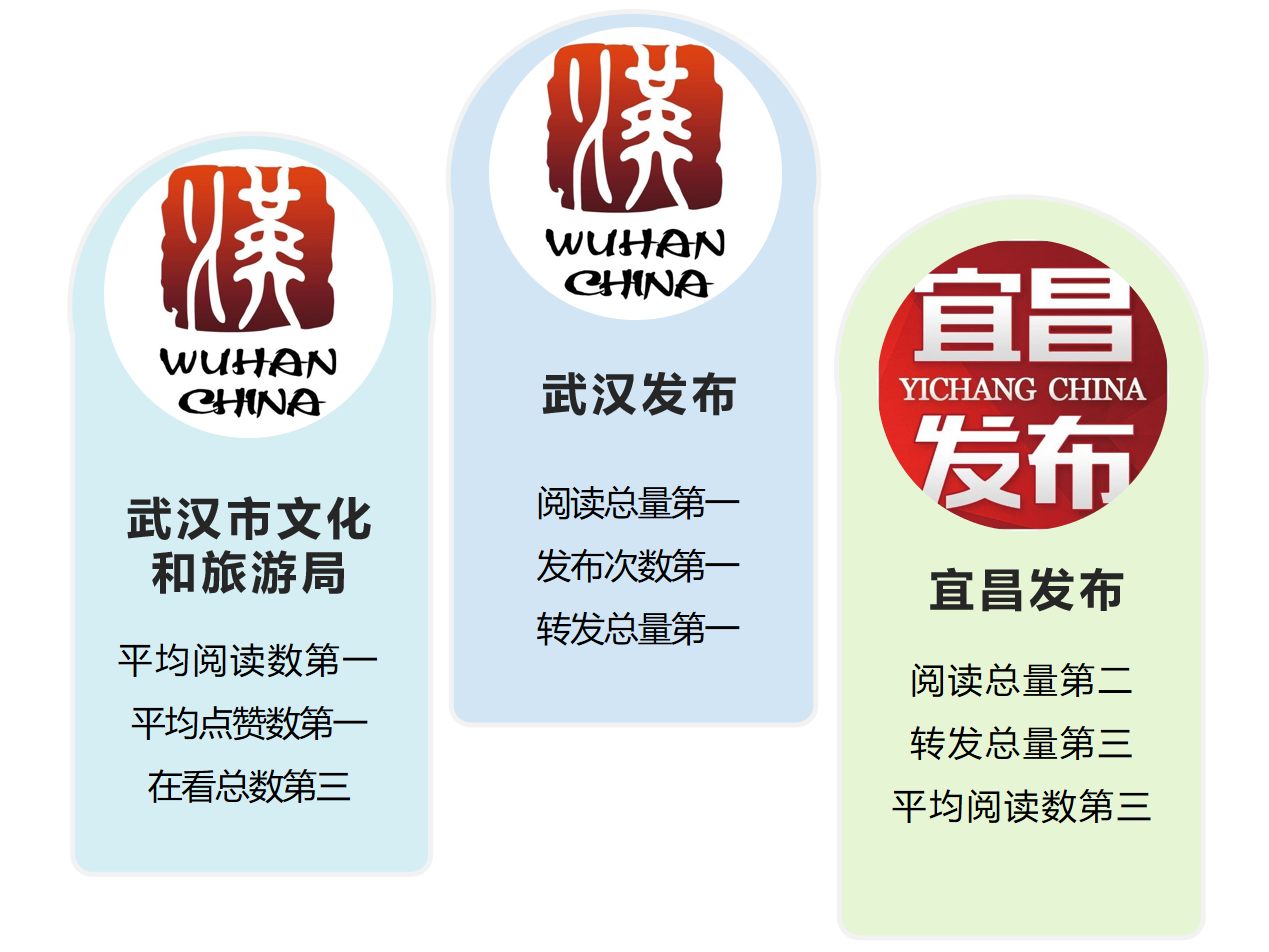 從原創文章排行榜看,本期上榜文章來自11個賬號,“武漢女性”“觀英閣”2個賬號新登榜單,其余賬號分別是“武漢市文化和旅游局”“武漢美術館”“十堰發布”“武漢交警”“武漢發布”“荊州發布”“十堰文旅”“武漢消防”“襄陽交警”。本期原創熱文TOP30中,“武漢市文化和旅游局”11篇,比上月增加7篇;“武漢美術館”4篇,與上期保持一致;“十堰發布”和“武漢交警”各3篇;“武漢發布”和“武漢女性”各2篇;“觀英閣”“荊州發布”“十堰文旅”“武漢消防”“襄陽交警”各1篇。閱讀量10萬+原創爆款文章共4篇,其中“武漢交警”的《持續七天 單向通行》位列第一;“武漢市文化和旅游局”發布的3篇文章包攬剩下第二至第四名,分別是《奧運冠軍來比賽,煙花連放7天……武漢國慶太嗨了!》《60年一遇!今天在武漢,看超級月亮!》《今晚開幕式,點亮長江!》。