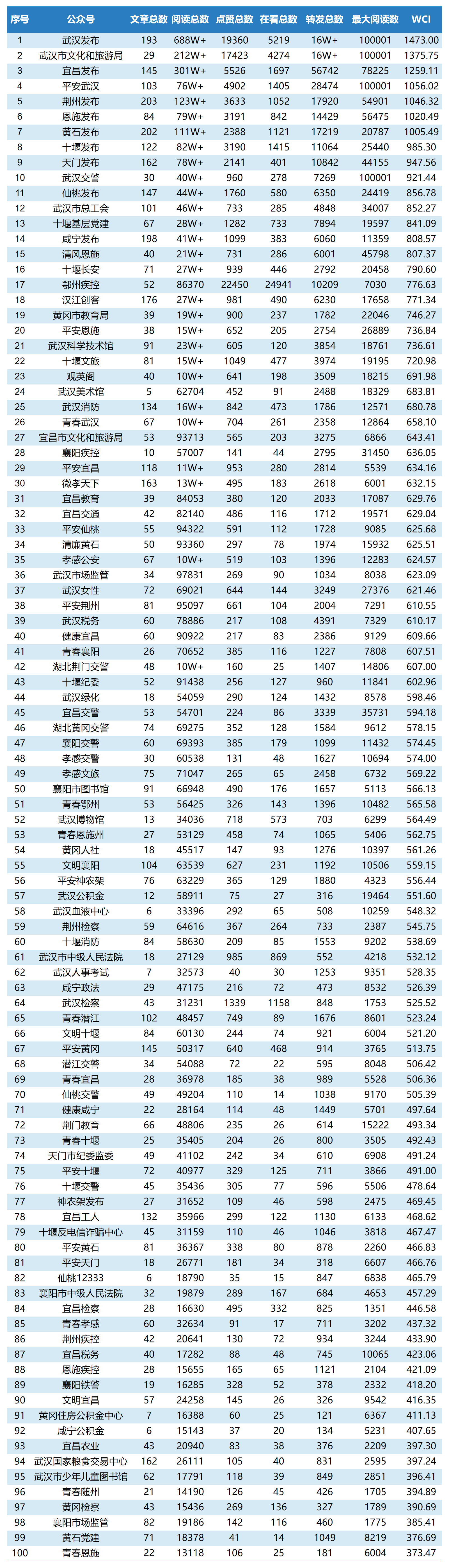 圖:湖北市州微信排行榜TOP100