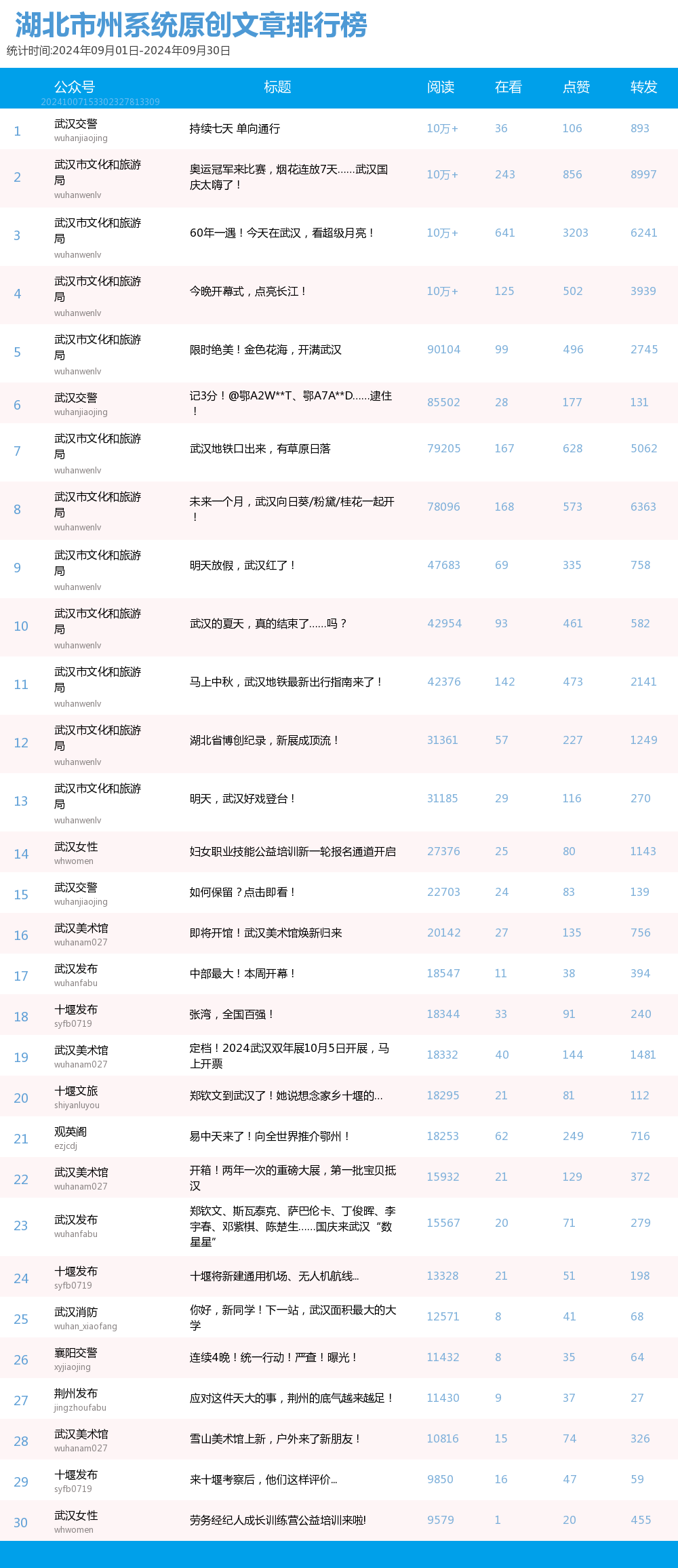10月10日,由荊楚網(湖北日報網)、楚天輿情數據研究院制作的湖北市州微信排行榜2024年9月榜單發布,“武漢發布”“武漢市文化和旅游局”“宜昌發布”蟬聯前三。本月,“平安武漢”閱讀總數增量排名第二,高達34萬+;“武漢女性”“觀英閣”立足于賬號定位,新登原創文章閱讀量TOP30。