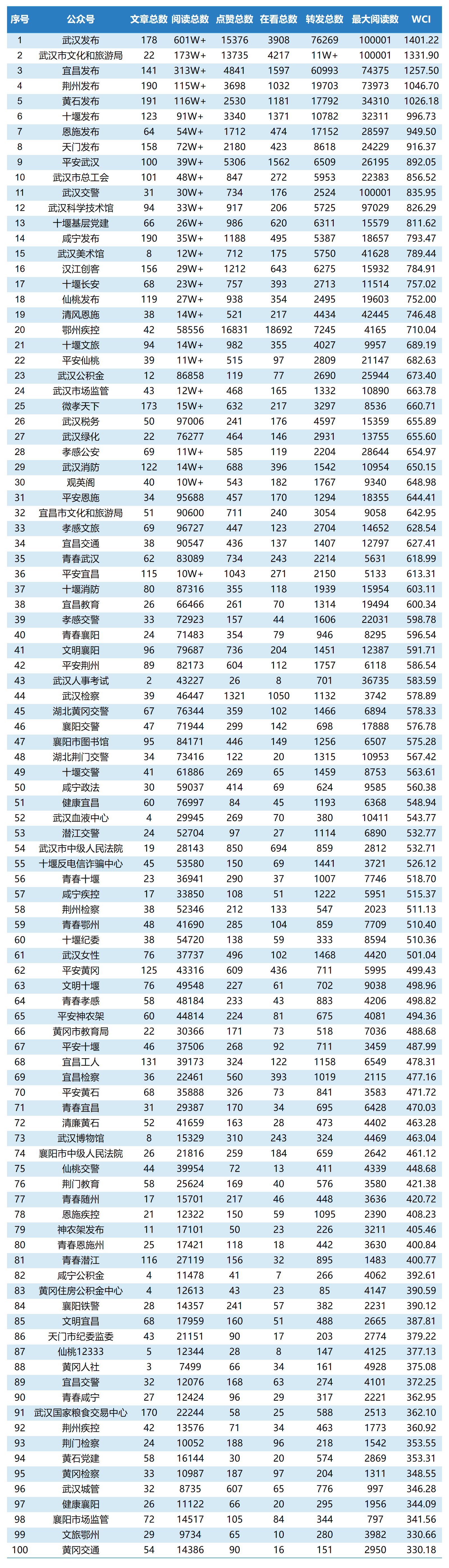 2、樣本范圍和數(shù)量每月會(huì)根據(jù)實(shí)際情況進(jìn)行微調(diào)。歡迎湖北省政務(wù)新媒體的運(yùn)營(yíng)部門或負(fù)責(zé)人自薦,加入排行榜,聯(lián)系電話:027-88567710。