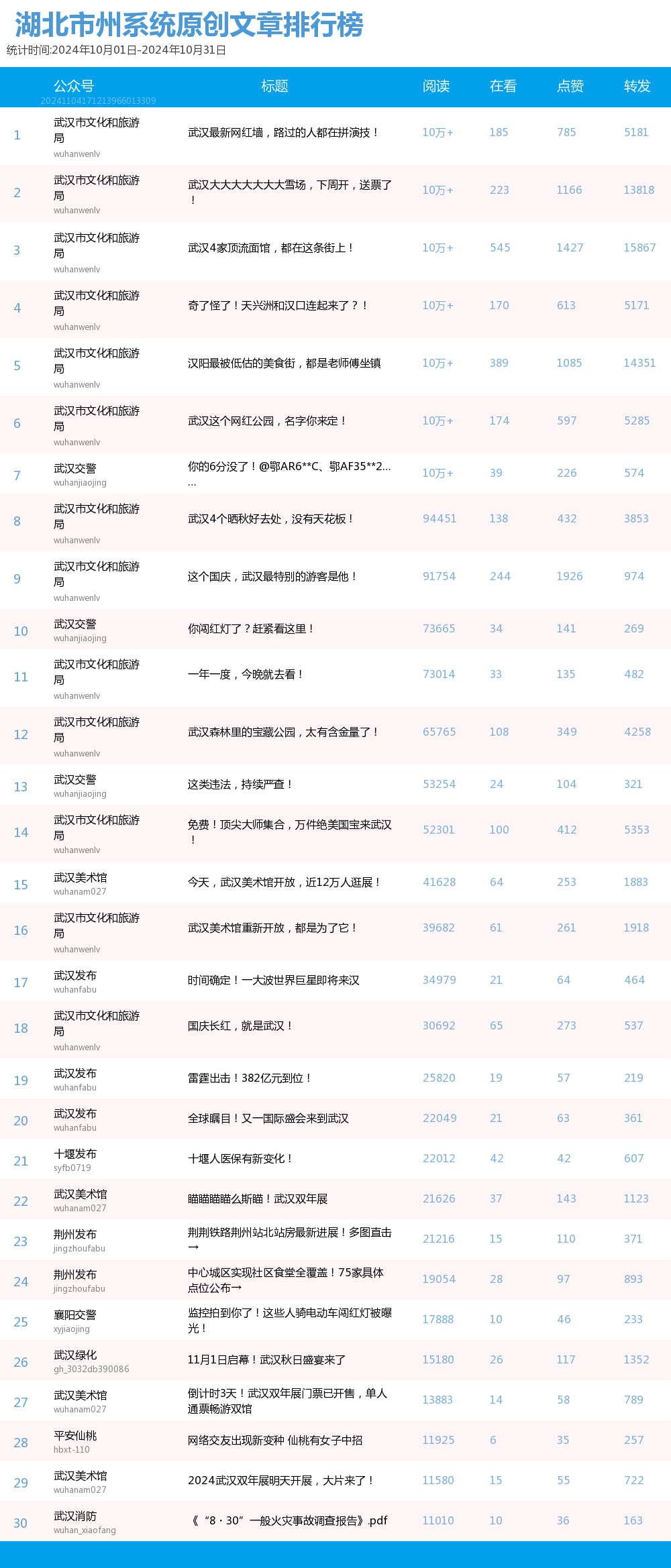 從原創(chuàng)文章排行榜看,本期上榜文章來自10個(gè)賬號(hào),分別是“武漢市文化和旅游局”“武漢美術(shù)館”“武漢發(fā)布”“武漢交警”“荊州發(fā)布”“平安仙桃”“十堰發(fā)布”“武漢綠化”“武漢消防”“襄陽交警”。本期原創(chuàng)熱文TOP30中,“武漢市文化和旅游局”13篇,比上月增加2篇;“武漢美術(shù)館”4篇,與上期保持一致;“武漢發(fā)布”和“武漢交警”各3篇;“荊州發(fā)布”2篇;其余賬號(hào)各1篇。閱讀量10萬+原創(chuàng)爆款文章共7篇,其中“武漢市文化和旅游局”發(fā)布《武漢最新網(wǎng)紅墻,路過的人都在拼演技!》《武漢這個(gè)網(wǎng)紅公園,名字你來定!》《奇了怪了!天興洲和漢口連起來了?!》等文章包攬前6篇,正式上新的園博園漢口里《老漢口碼頭》手繪墻畫、四美塘文化公園的新名字、有西北大漠鹽湖之感的枯水期天興洲備受輿論關(guān)注?!拔錆h交警”的《你的6分沒了!@鄂AR6**C、鄂AF35**2……》位列第七,交通違法曝光臺(tái)依舊發(fā)揮警示作用,本期集中曝光部分國(guó)慶假期“占用高速公路應(yīng)急車道”的違法車輛,希望廣大駕駛員引以為戒。