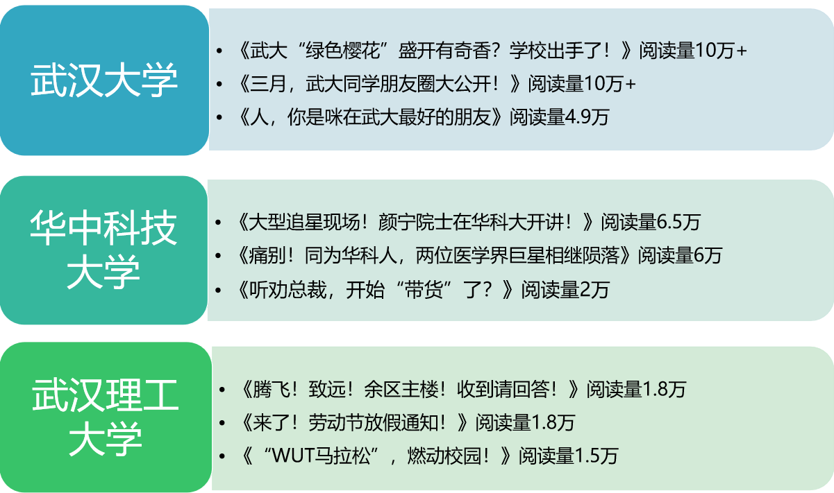 高校教學見成果。近期,多所高校憑硬實力“出圈”。2023年高等院??萍汲晒D化總合同金額前30名榜單中,華中科技大學位列全國第三名;2025中國大學本科畢業生就業質量排名中,武漢紡織大學位列湖北省屬高校第一名;2025軟科中國大學排名中,湖北大學位列湖北省屬高校第一名。期間,華中科技大學發布文章解析學校在科技成果轉化方面取得的顯著成效,此類圖文相結合的推介形式值得借鑒。此外,武漢大學、湖北大學、長江大學等宣布新增本科專業,相關一手信息能夠推高賬號的關注度和文章的討論度。