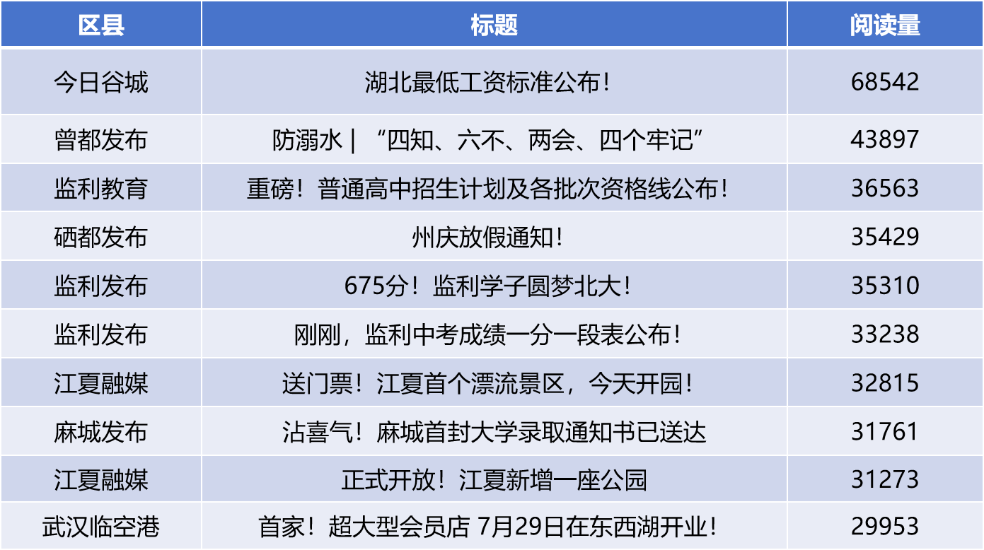 文旅地標再添新色,城市服務持續升級。7月,湖北區縣微信公眾號通過宣傳漂流景區、公園的開放,體現區域文旅資源擴容,預告超大型會員店開業彰顯消費場景升級,集中輸出利好事件,滿足用戶對生活動態的信息需求,強化正向心理感知。“江夏融媒”發布《送門票!江夏首個漂流景區,今天開園!》,通過展現區域內漂流休閑項目的“從無到有”,突出稀缺價值,以“送門票”作為吸睛點,將用戶利益點前置,精準擊中“休閑娛樂+薅羊毛”的需求,有效提升用戶點擊欲望與互動意愿,助推內容轉化率上升。該賬號還發布《正式開放!江夏新增一座公園》,聚焦與居民生活密切相關的基礎配套設施,精準對接大眾日常散步、親子休閑、健身放松的高頻需求,內容實用性強,易引發共鳴。同時文章突出區域生活環境的升級迭代,傳遞“江夏宜居屬性提升”的正向信號,潛移默化地強化居民對本地發展的認同感與歸屬感。“武漢臨空港”發文《首家!超大型會員店7月29日在東西湖開業!》,提前官宣WS江豚會員店的開業消息,鎖定東西湖居民對“大型商超、會員制消費”的需求缺口,通過對會員店的設施及服務的介紹,傳遞“家門口享受優質消費資源”的利好,增強用戶對區域商業發展的期待。