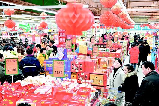 圖為:中百倉儲首義路店,市民在琳瑯滿目的年貨中選購。(湖北日報全媒記者 魏錸 攝)