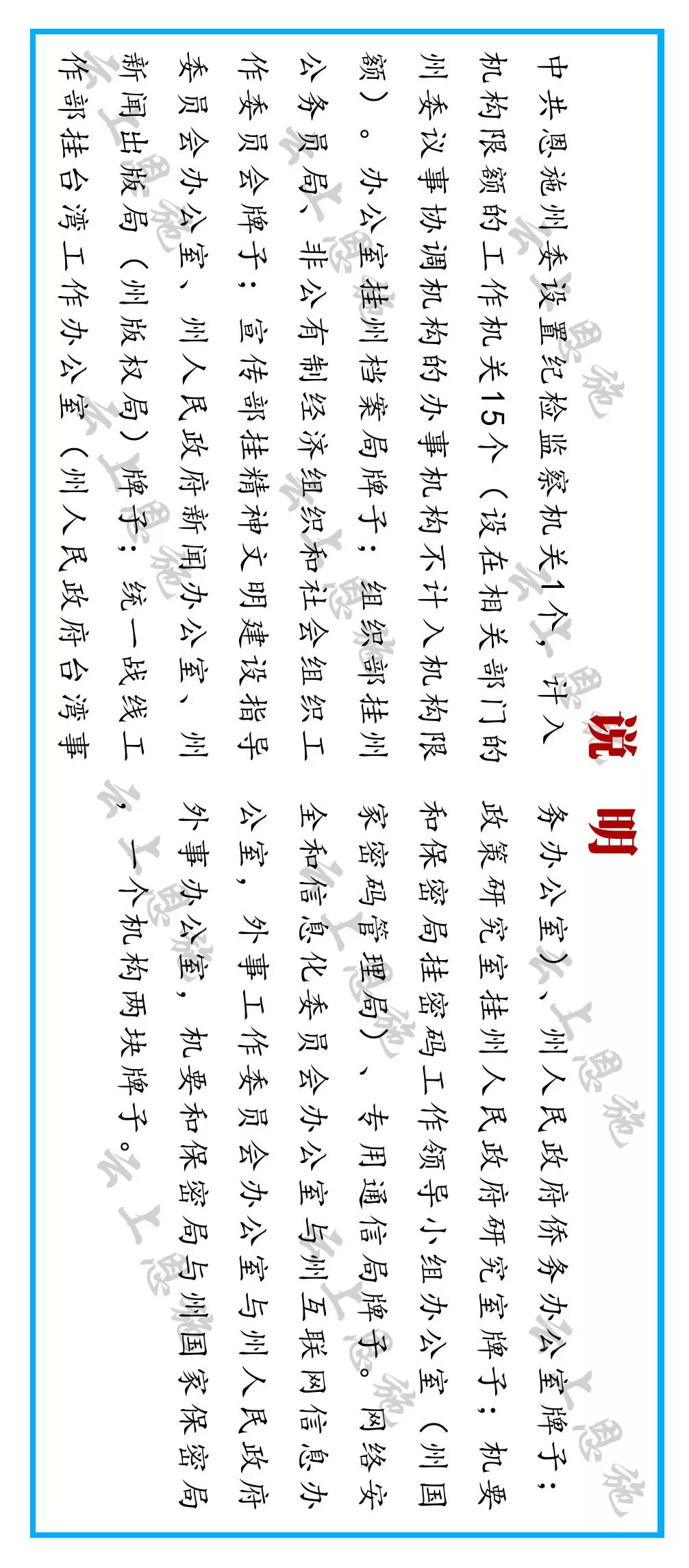 州委宣傳部對外加掛州委精神文明建設指導委員會辦公室、州人民政府新聞辦公室牌子。