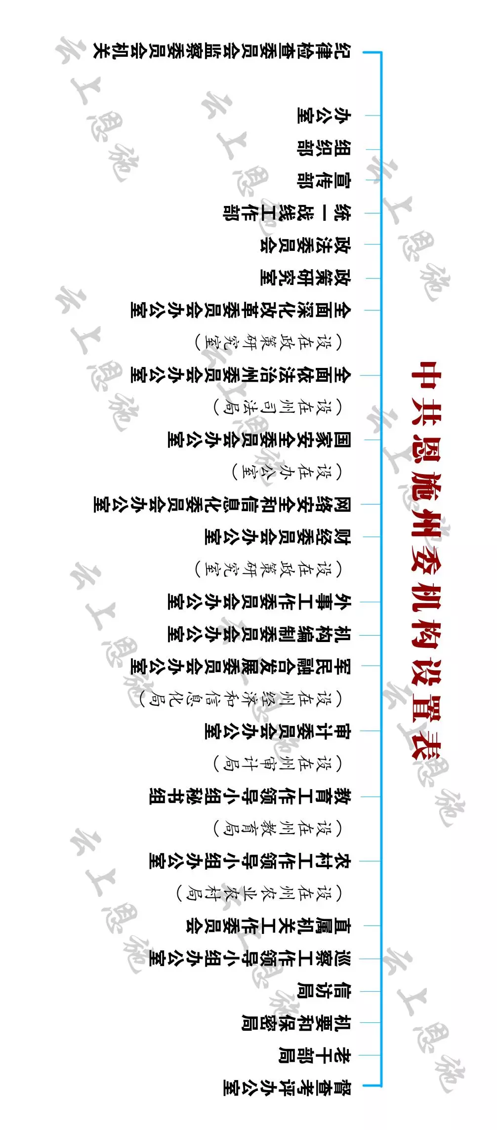 組建州委全面依法治州委員會。 辦公室設在州司法局。將州委法治恩施建設領導小組及其辦公室、州依法治州領導小組及其辦公室的職責交由州委全面依法治州委員會及其辦公室承擔。不再保留州委法治恩施建設領導小組及其辦公室、州依法治州領導小組及其辦公室。