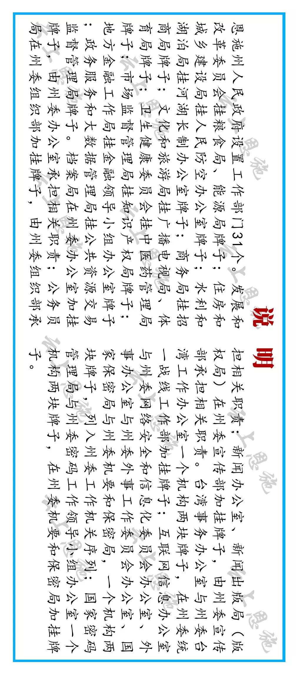 州委宣傳部統一管理新聞出版工作。 將州文化體育新聞出版廣電局的新聞出版管理職責和有關電影管理職責劃入州委宣傳部。州委宣傳部對外加掛州新聞出版局(州版權局)牌子。
