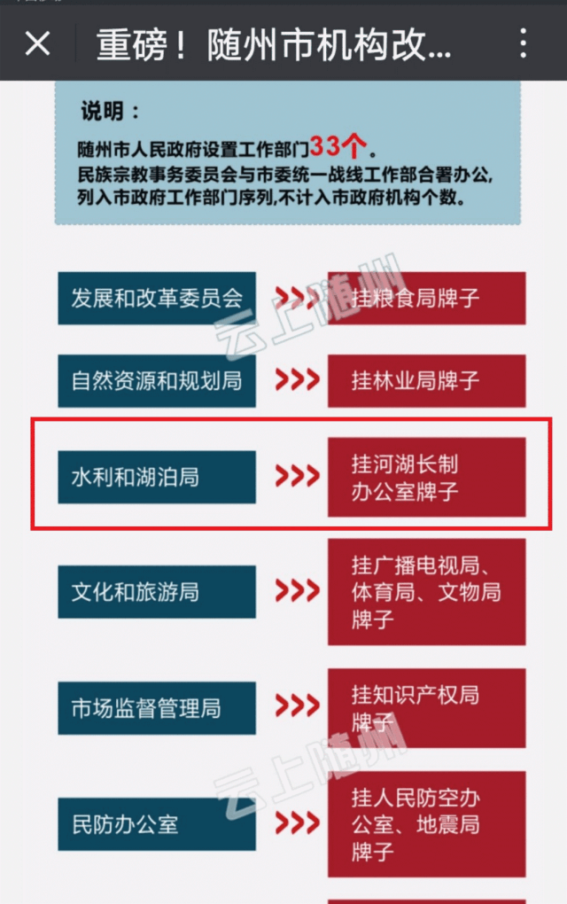 批準各市州、直管市、神農架林區政府工作部門設“水利和湖泊局”,并加掛“河湖長制辦公室”牌子。將河湖長制辦公室確定為常設機構(與之前加掛在水利部門的防汛抗旱指揮部辦公室類似),為湖北河湖長制高質量發展提供了堅實的組織保障!