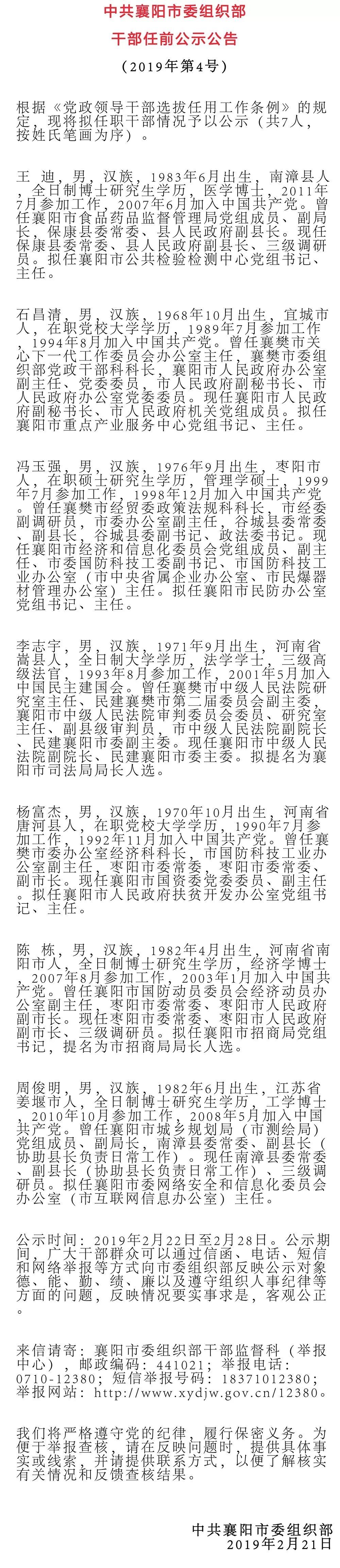 公示時間:2019年2月22日至2019年2月28日。公示期間,廣大干部群眾可以通過信函、電話和網絡舉報等方式向市委組織部反映公示對象德、能、勤、績、廉以及遵守組織人事紀律等方面的問題,反映情況要實事求是,客觀公正。提倡實名舉報,以便調查核實。