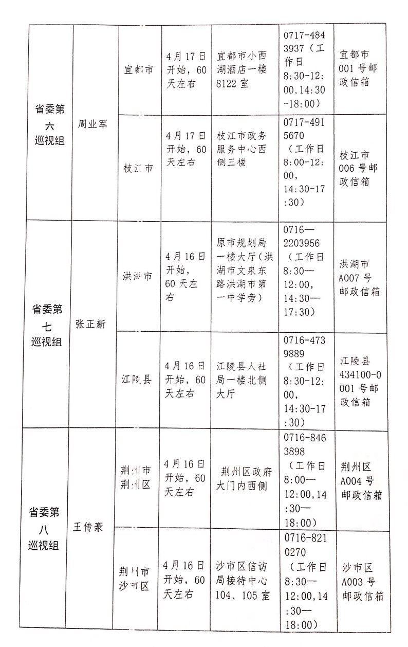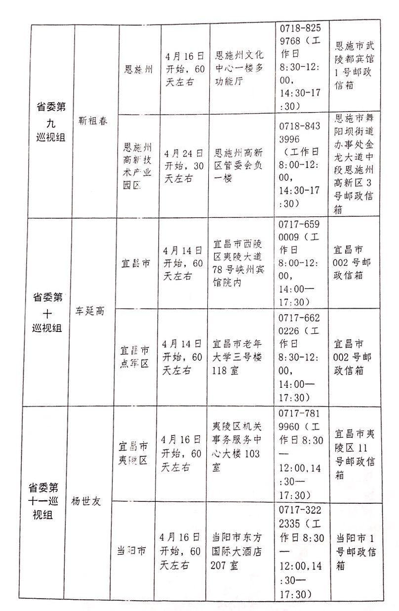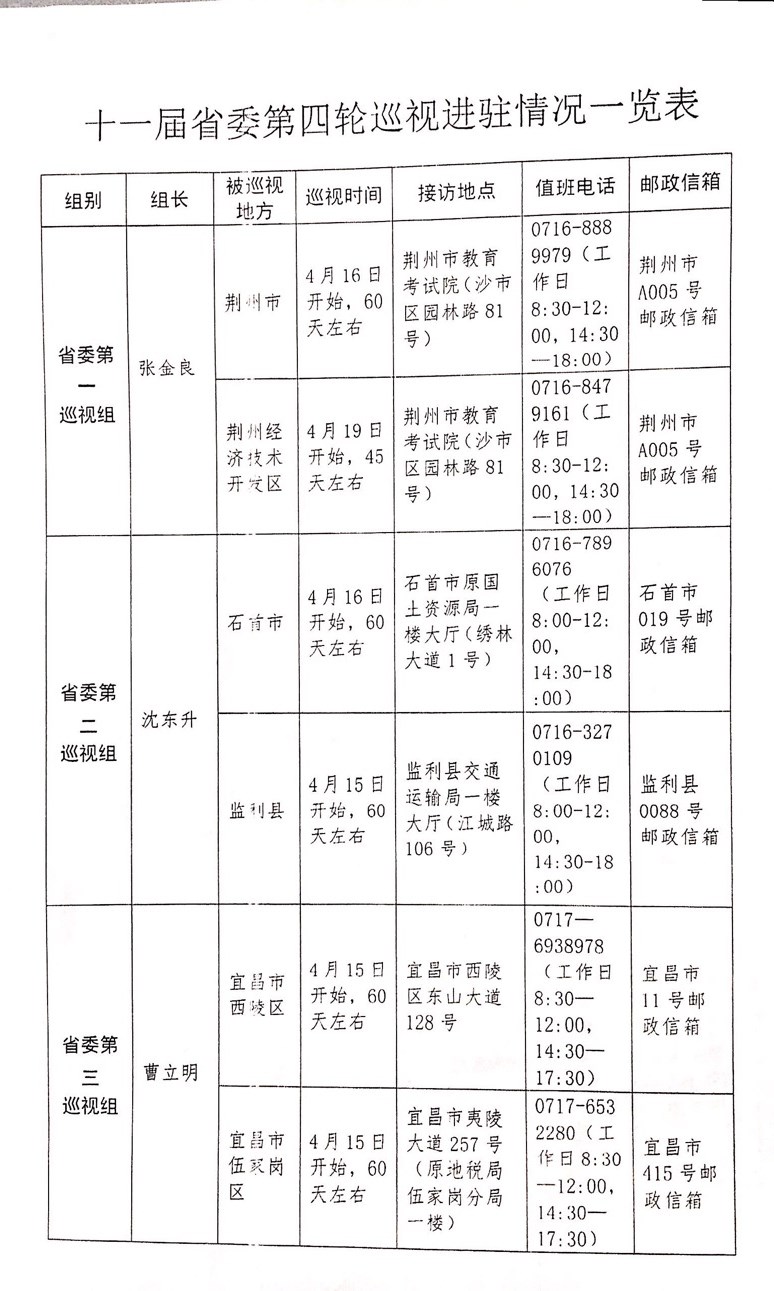 湖北日?qǐng)?bào)訊(記者楊宏斌、通訊員沈巡、實(shí)習(xí)生徐琳)截至4月24日,十一屆省委第四輪巡視已完成對(duì)宜昌市、荊州市、恩施州3個(gè)市州,宜都市、枝江市、當(dāng)陽市、宜昌市夷陵區(qū)、宜昌市西陵區(qū)、宜昌市猇亭區(qū)、宜昌市點(diǎn)軍區(qū)、宜昌市伍家崗區(qū)、荊州市荊州區(qū)、荊州市沙市區(qū)、江陵縣、松滋市、公安縣、石首市、監(jiān)利縣、洪湖市16個(gè)縣(市、區(qū)),宜昌高新技術(shù)產(chǎn)業(yè)開發(fā)區(qū)(宜昌經(jīng)濟(jì)技術(shù)開發(fā)區(qū))、長(zhǎng)江三峽風(fēng)景名勝區(qū)宜昌管理委員會(huì)(宜昌三峽旅游新區(qū)管理委員會(huì))、荊州經(jīng)濟(jì)技術(shù)開發(fā)區(qū)、恩施州高新技術(shù)產(chǎn)業(yè)園區(qū)4個(gè)開發(fā)區(qū)(功能區(qū))的進(jìn)駐。