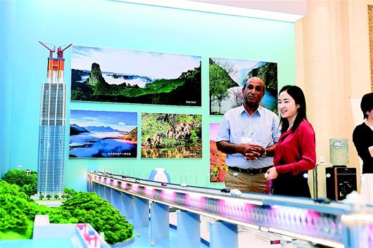 中建三局研制的“空中造樓機”,世界首創,每四天就能建好一層樓,可以縮短20%的建筑工期,能夠建造千米級的超高層建筑。中阿衛視記者巴希爾興趣十足,詳細了解后不?!包c贊”;來自巴基斯坦的記者阿斯加爾表示,希望他的家鄉也能用上造樓機。