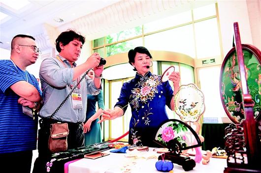 圖為:參會媒體記者在漢繡展臺了解漢繡工藝。