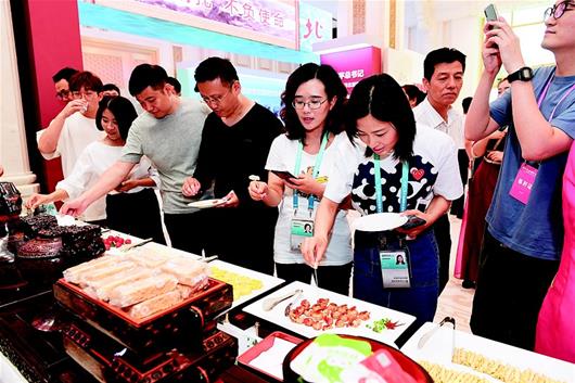 潛江小龍蝦、荊州羋月糕、洪湖鮮藕帶、襄陽小麻花、咸寧桂花糕、櫻桃山藥……十種小食、四種飲料、兩款茶飲,展廳中的湖北美食展臺人氣旺。